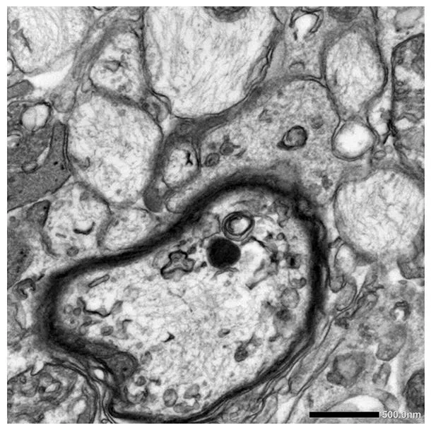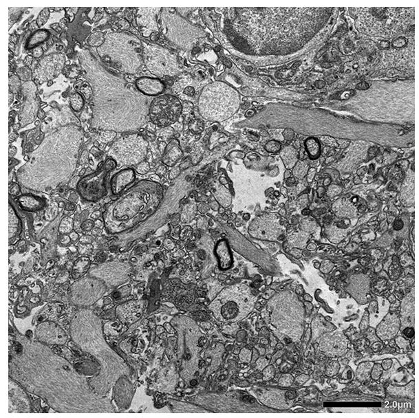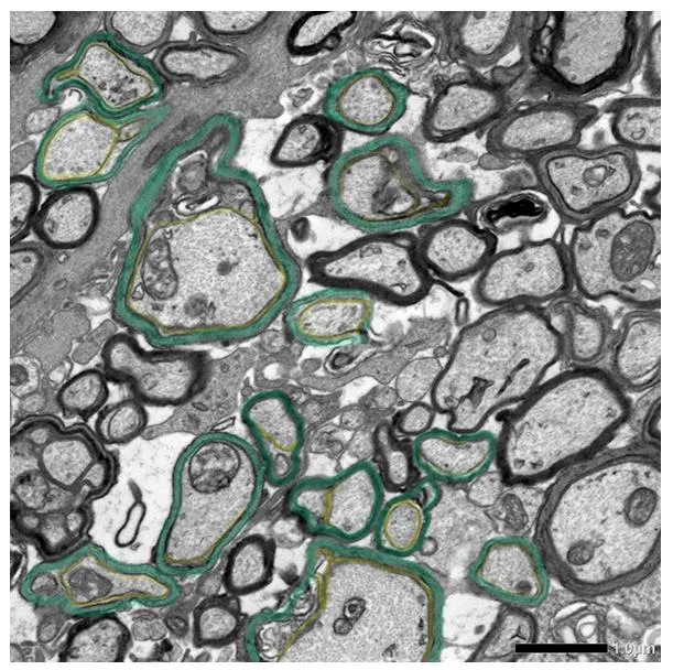 Patients with MS exhibit damaged myelin and nerve fibres (demyelination)