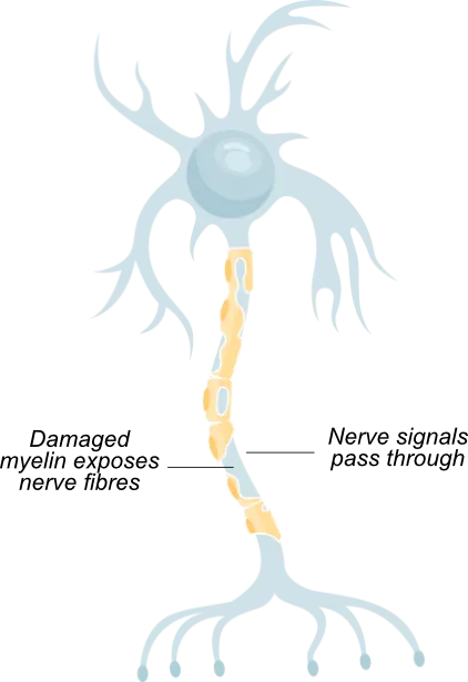 MS is an autoimmune disease that damages the myelin coating around nerve fibres, causing disruption of nerve signals
