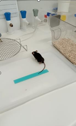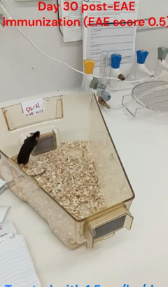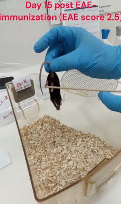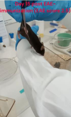 Day 15: The mouse exhibits MS symptoms (tail and hind limb paralysis) and was unable to walk properly
